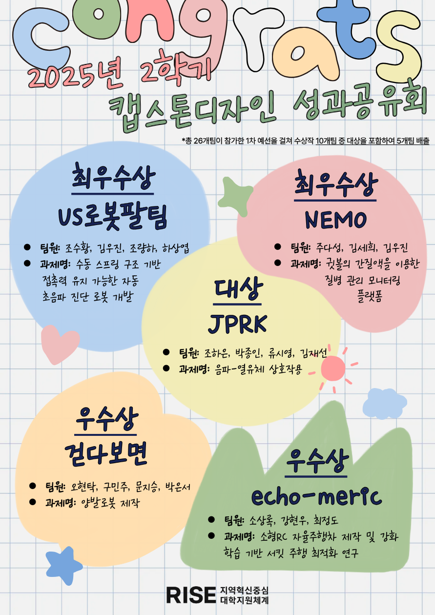 기계공학부 팀의 수상작들은 ▲(대상) 음파-열유체 상호작용 ▲(최우수상) 수동 스프링 구조 기반 접촉력 유지 가능한 자동 초음파 진단 로봇 개발 ▲(최우수상) 귓불의 간질액을 이용한 질병 관리 모니터링 플랫폼 ▲(우수상) 소형RC 자율주행차 제작 및 강화학습 기반 서킷 주행 최적화 연구 ▲(우수상) 양발로봇 제작 이며, 모두 설계와 제어 등 다양한 분야에서 현실적이고 창의적인 아이디어를 제시하여 기술 구현 능력과 완성도 측면에서 호평을 받았다.